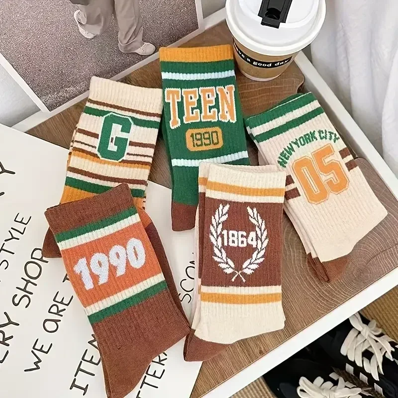 1 SET 5 Pairs Men's Retro Vintage Striped Mid-Calf Socks