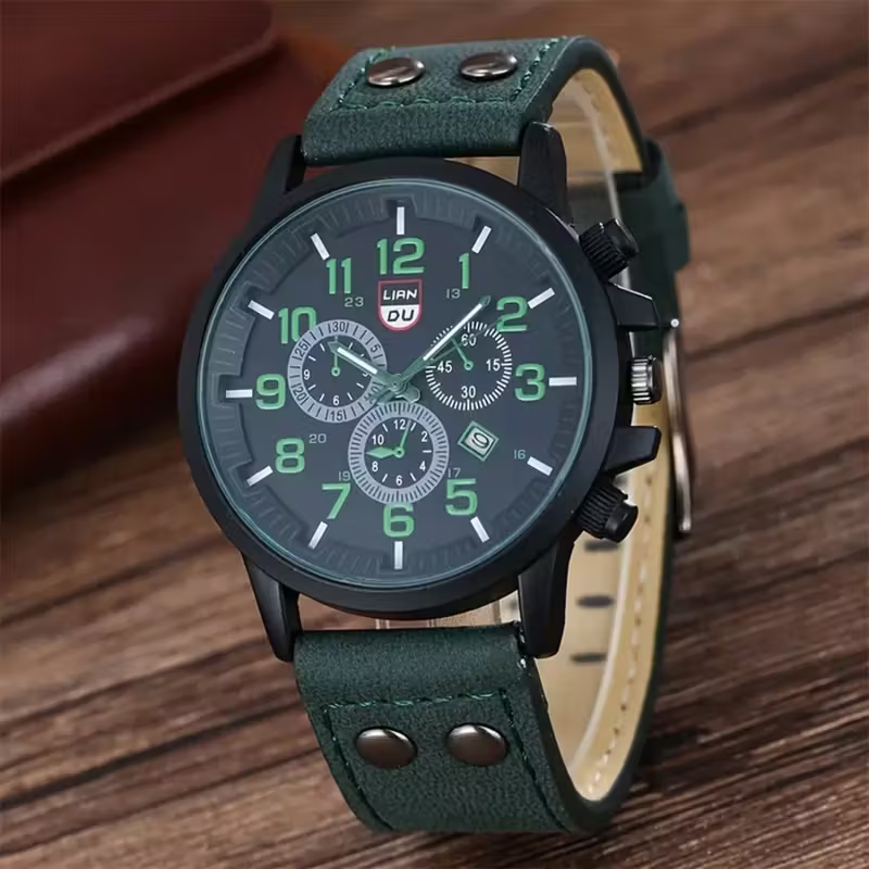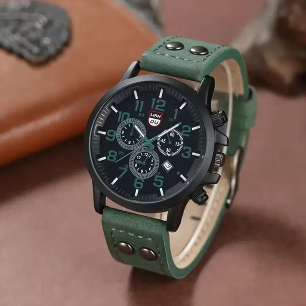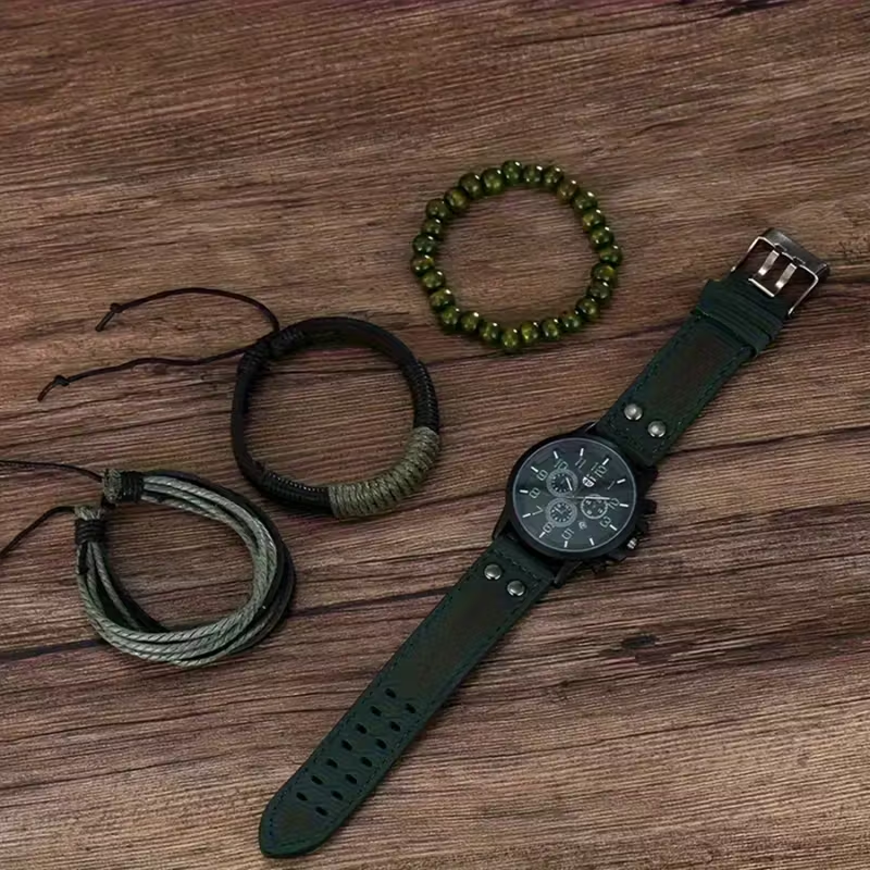 4pcs Men's Quartz Watch & Accessory Set - Green Dial Black Strap,