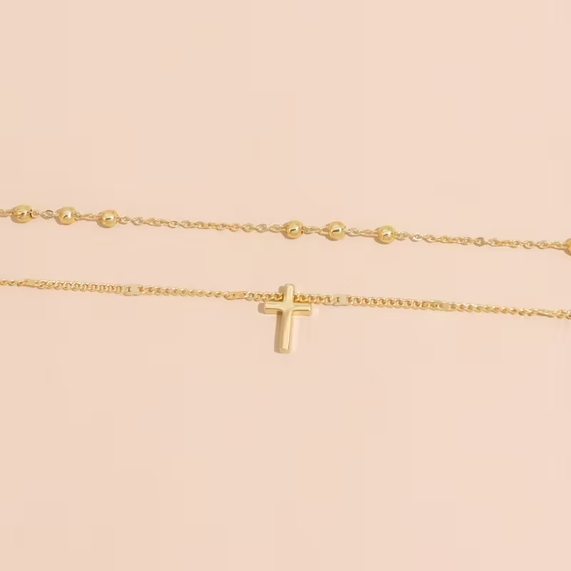 Vintage Cross Pendant Beads Chain Clavicle Chain Double Layer Necklace Ladies